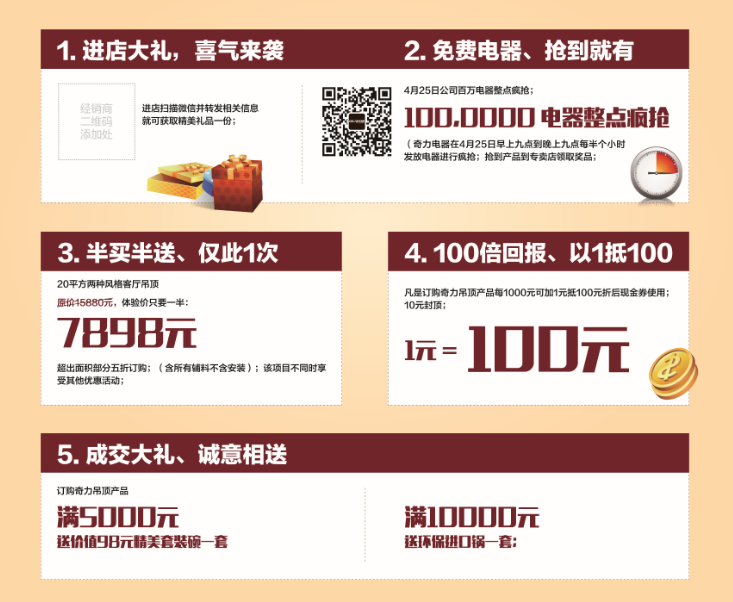 免費電器整點瘋搶。4月25日 09:00 -21:00 奇力吊頂微信公眾號定時發布電器免費禮券。搶到免費禮券即可到奇力專賣店兌換。活動當天進入 奇力吊頂 公眾號,發送 禮物 二字即可參與免費電器禮券活動。