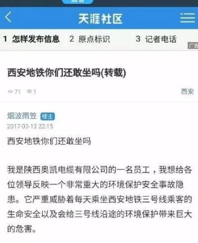 早前,一個自稱是某電纜公司員工的人發帖爆料,說西安地鐵3號線的電纜供應商提供了不合格的電纜。