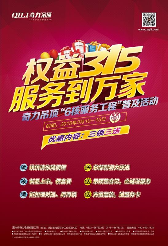 2015年3月15日,奇力吊頂,集成吊頂行業(yè)客廳吊頂領導者,暖風電器領導者,國家與行業(yè)標準起草單位,在消費者權益保護日這年度最重要的日子里,旗幟鮮明的推出了全國聯(lián)動的“權益315 ...